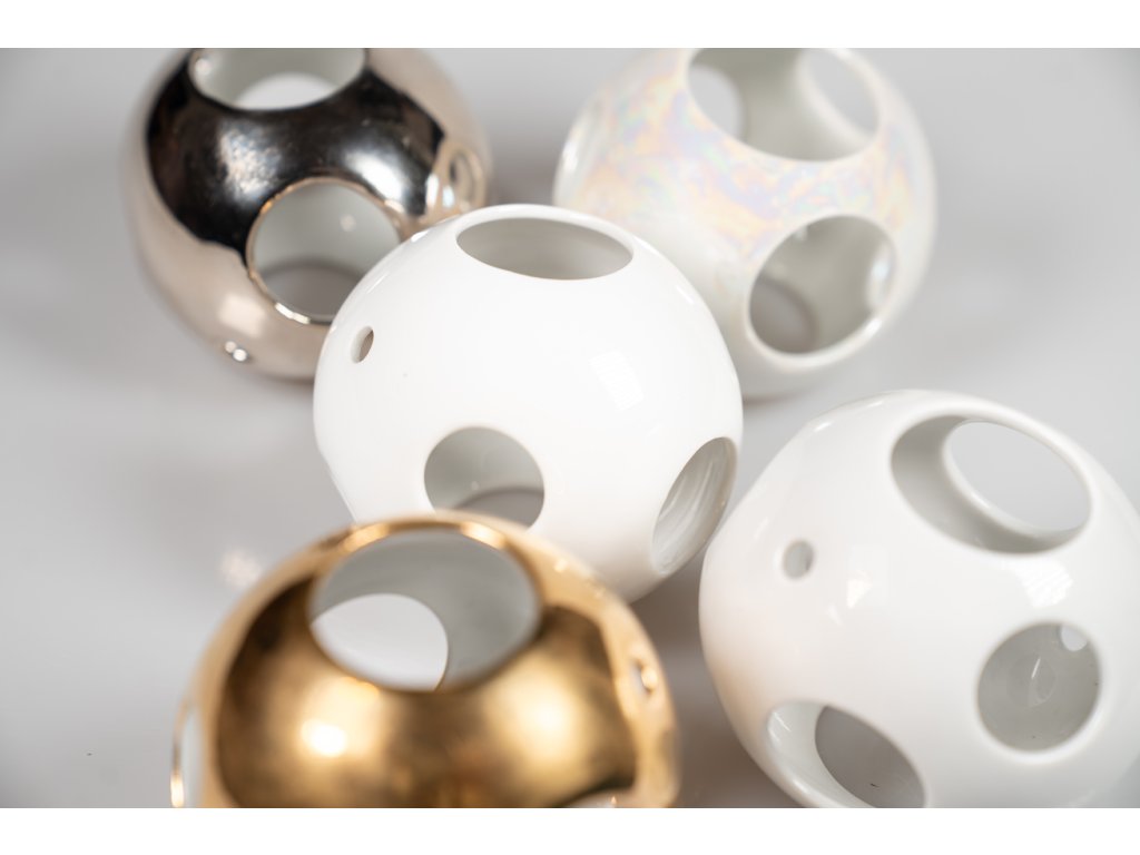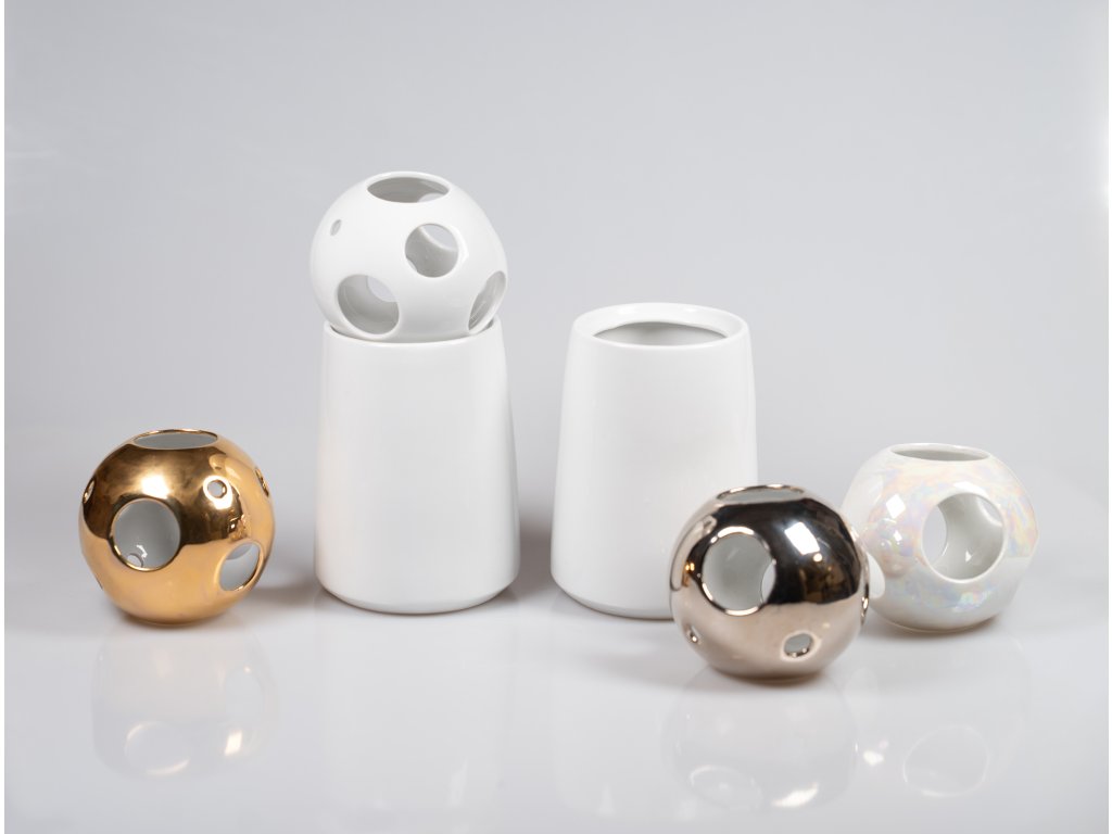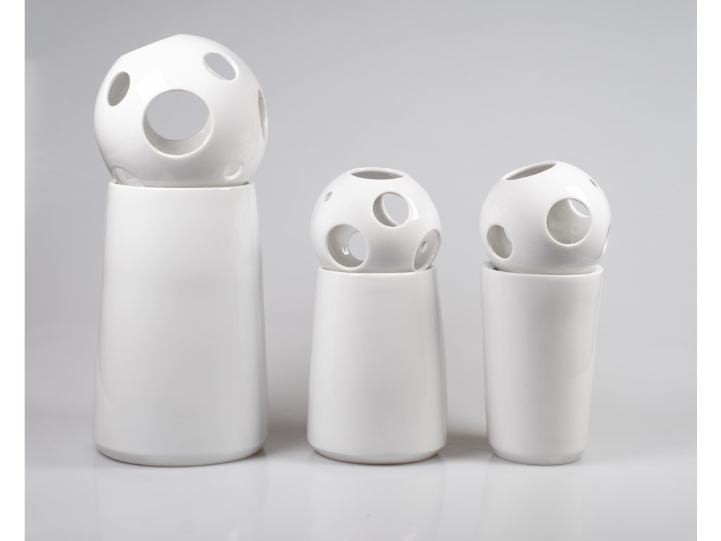 !!! POZOR NOVĚ !!! - menší vázička se dočkala stejně vysoké, avšak obráceně kónické ségry, čili je možné vybírat nově ze třech spodních tvarů - dva menší /ale stejně vysoké/ a jeden vyšší. Krásný doplněk do smart domova. Na výběr nyní máte z několika barev dekoračních koulí - bílá, perleťová, zlacená, platinová (stříbrný vzhled). Ve všech variantách se jedná o vypálenou povrchovou úpravu nanášenou pouze na vnější plášť koule, vnitřek tedy zůstává čistě bílý.